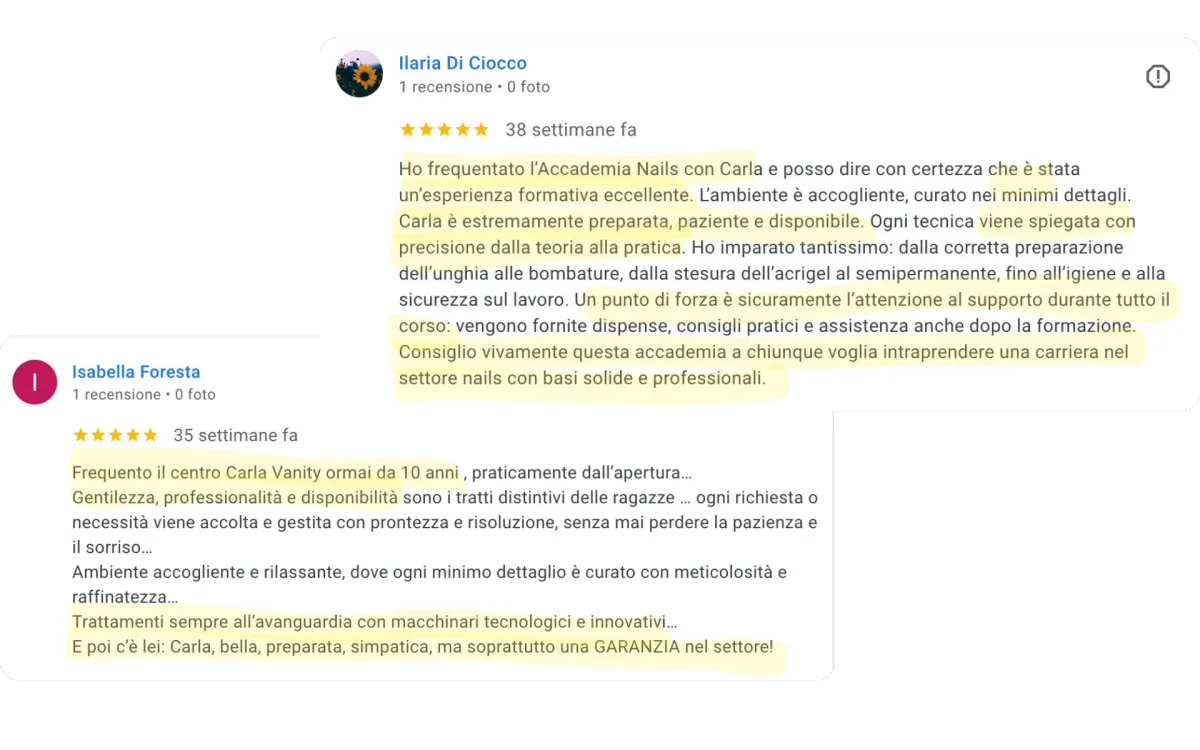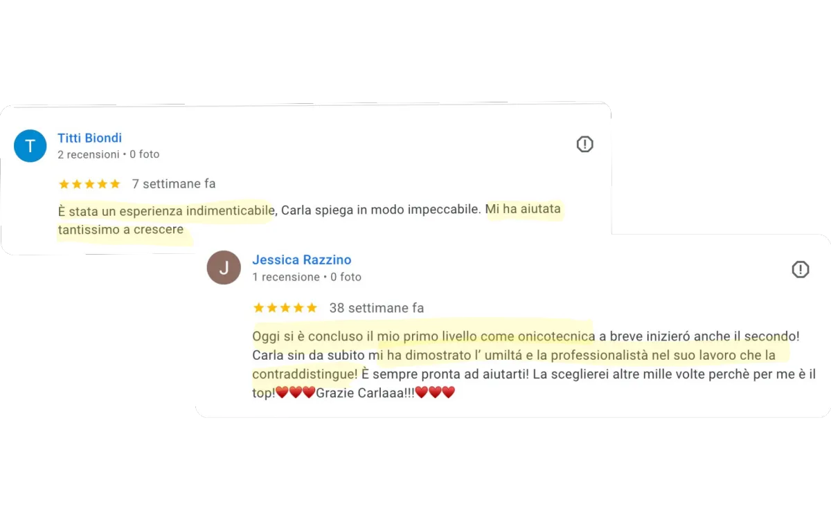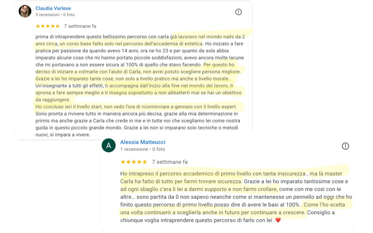 Durante il percorso verrai seguita passo dopo passo da Carla Nappi e dal suo team di Nail Master per sviluppare competenze tecniche solide e lavorare con maggiore sicurezza.